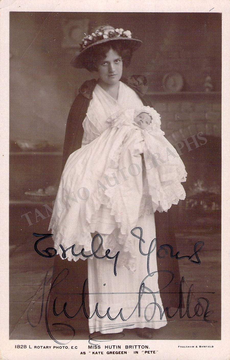 English actress (1876-1965) whose full name was Nelly Hutin Britton. Best known for her performances in Shakespearean roles early in the 20th century, and also also appeared in leading roles in two silent British films. Signed postcard photograph, shown as Kate Gregeen in the play "Pete". Photo by Rotary photo studio. Size is 3.5 x 5.25 inches, in excellent condition.