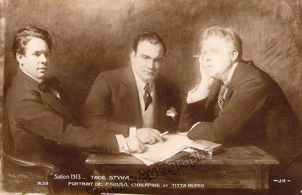 Black and white photo postcard showing the tenor with two other star performers of his era, Italian baritone Titta Ruffo and Russian Bass Feodor Chaliapin, shown as themselves, seated together and surrounded by various documents. Size is 3.5 x 5.25 inches, in excellent condition.
