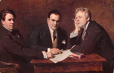 Beautiful colorized photo postcard showing the tenor with two other star performers of his era, Italian baritone Titta Ruffo and Russian Bass Feodor Chaliapin, shown as themselves, seated together and surrounded by various documents. Size is 3.5 x 5.5 inches, in excellent condition.