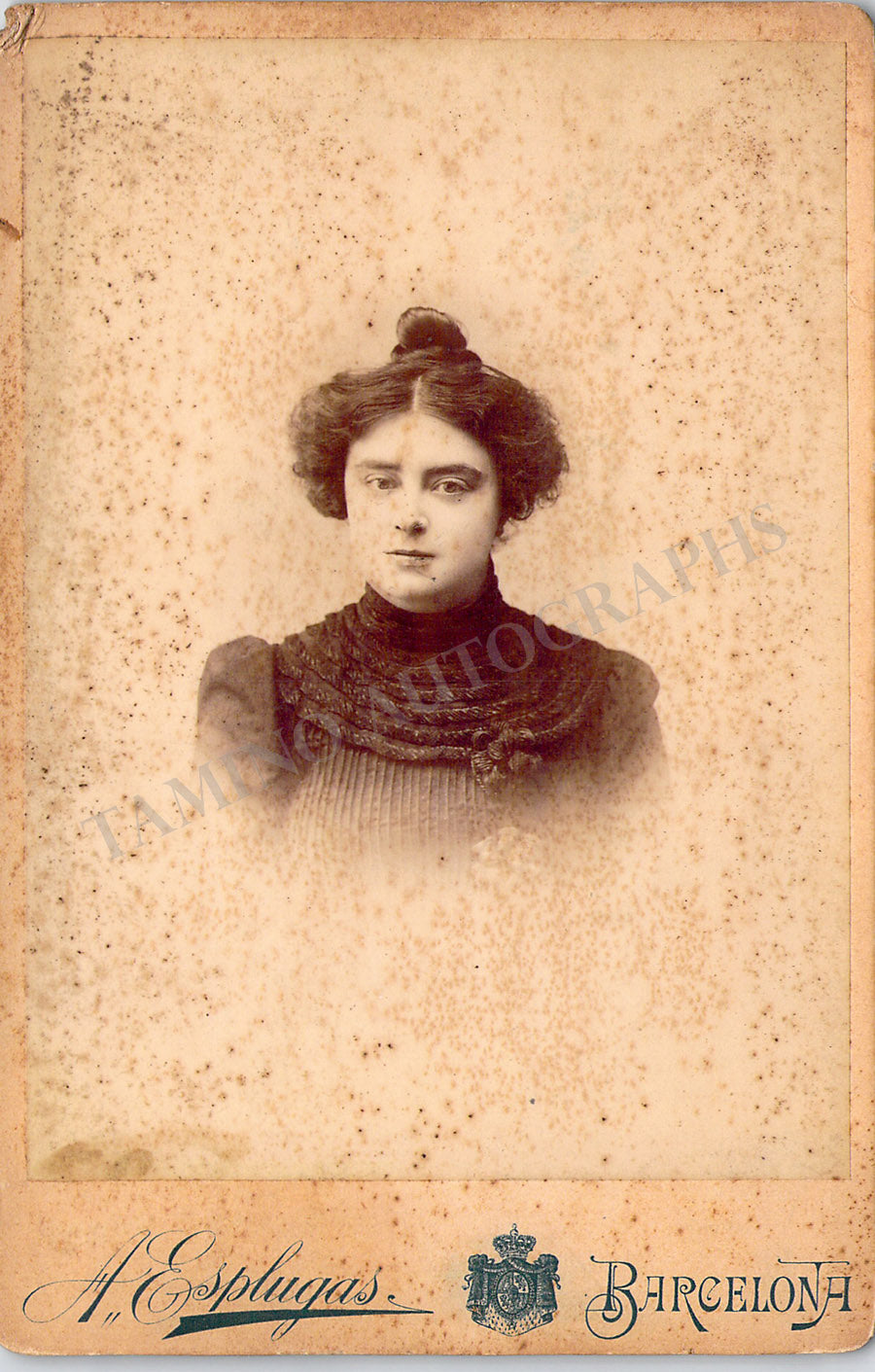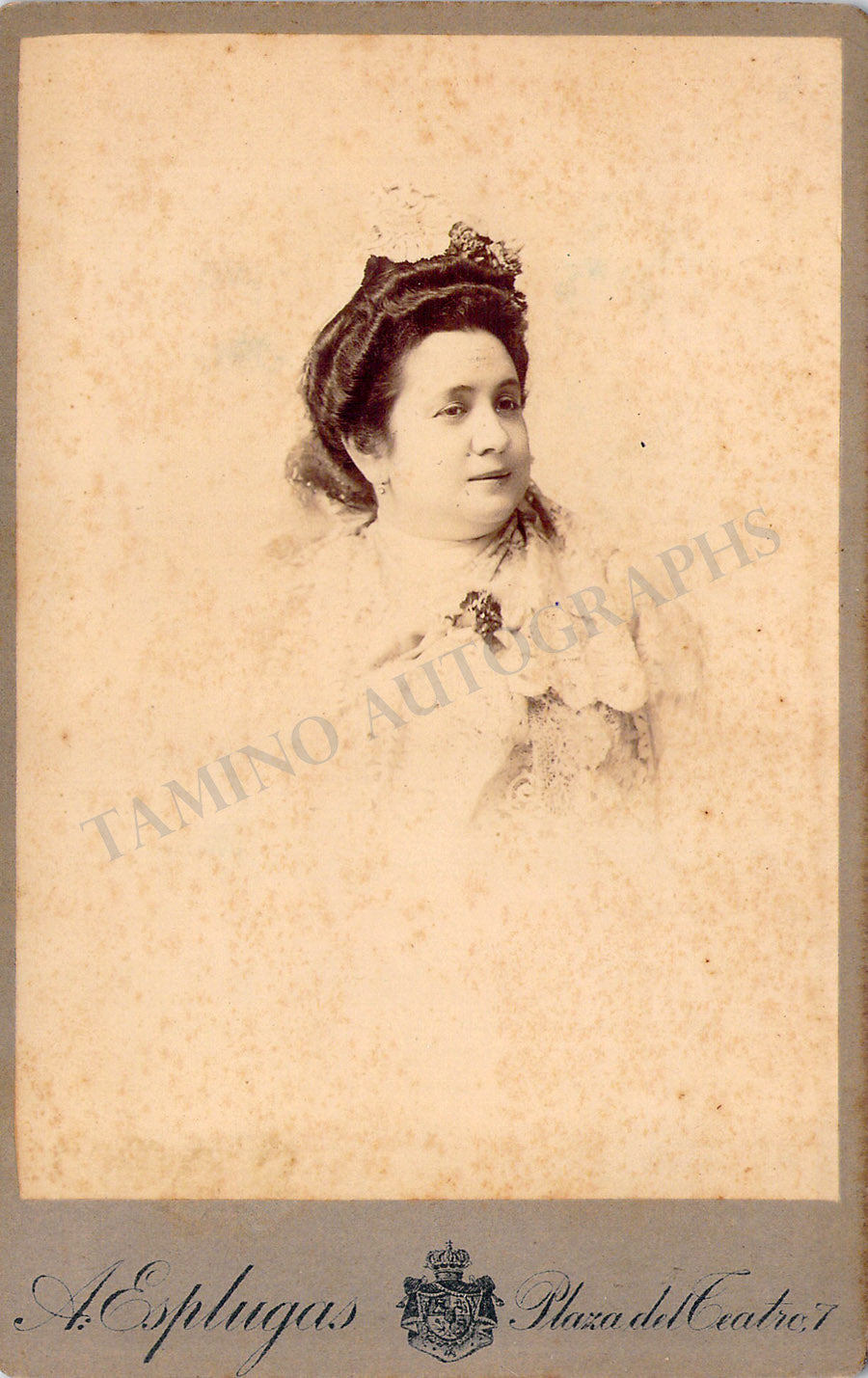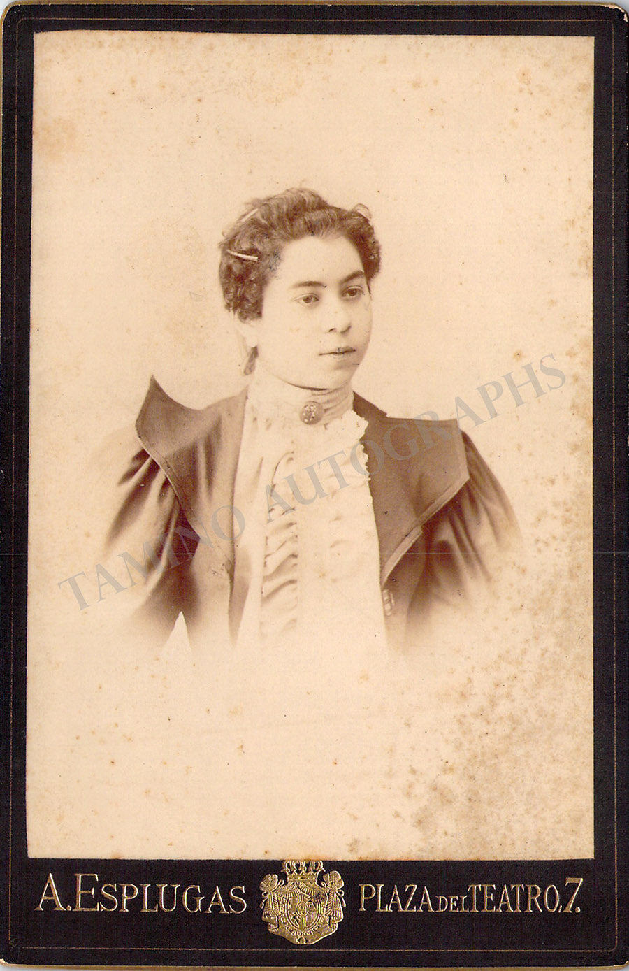 Vintage cabinet-style photograph of the singer shown as herself; spotted rust stains on the front, verso in excellent condition.