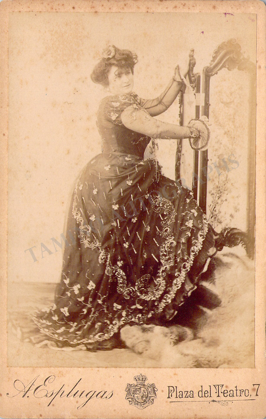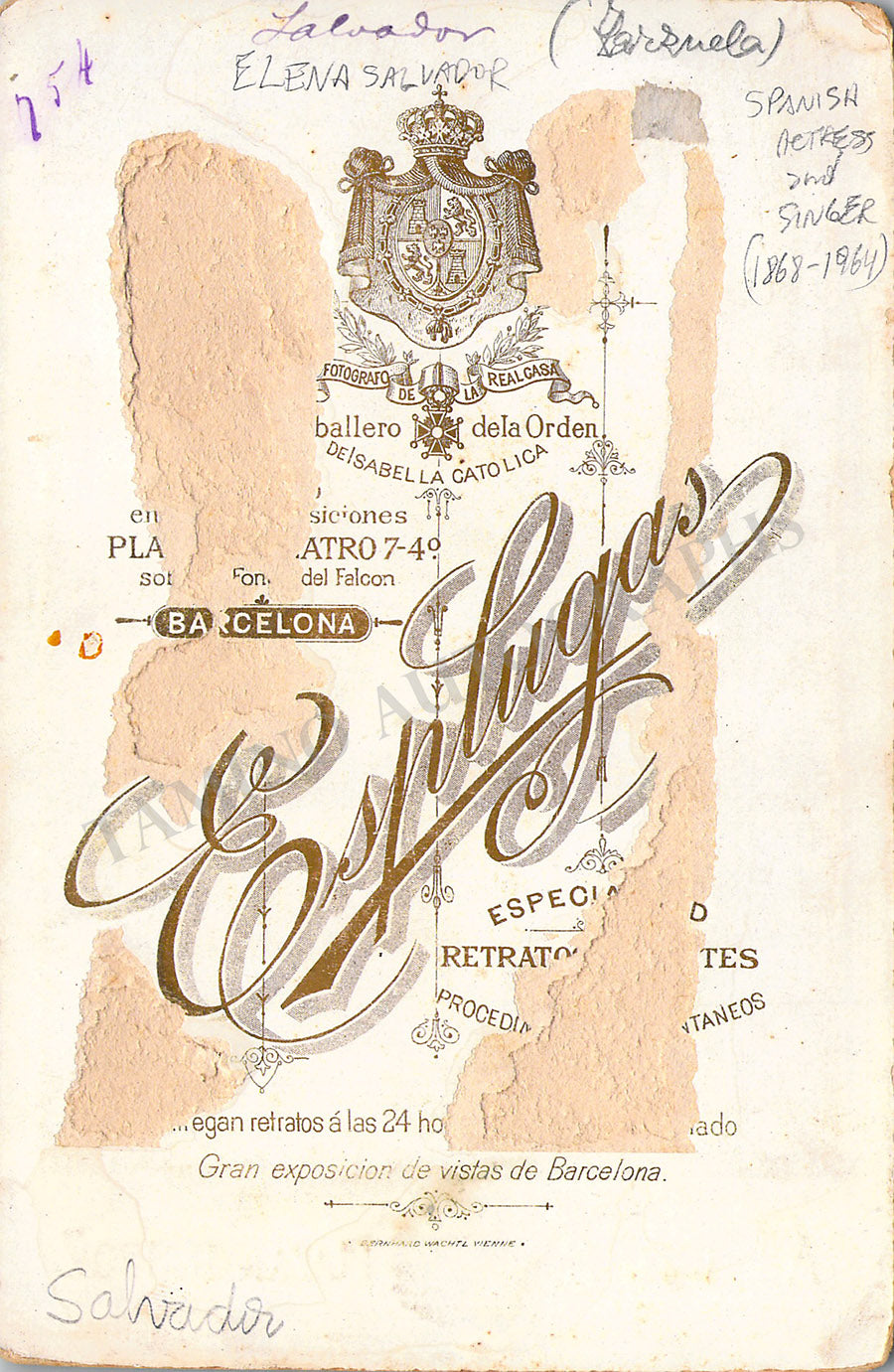Vintage cabinet-style photograph of the singer shown in role. Spotted rust on the front, ink markings on verso.
