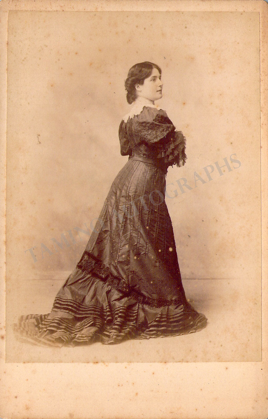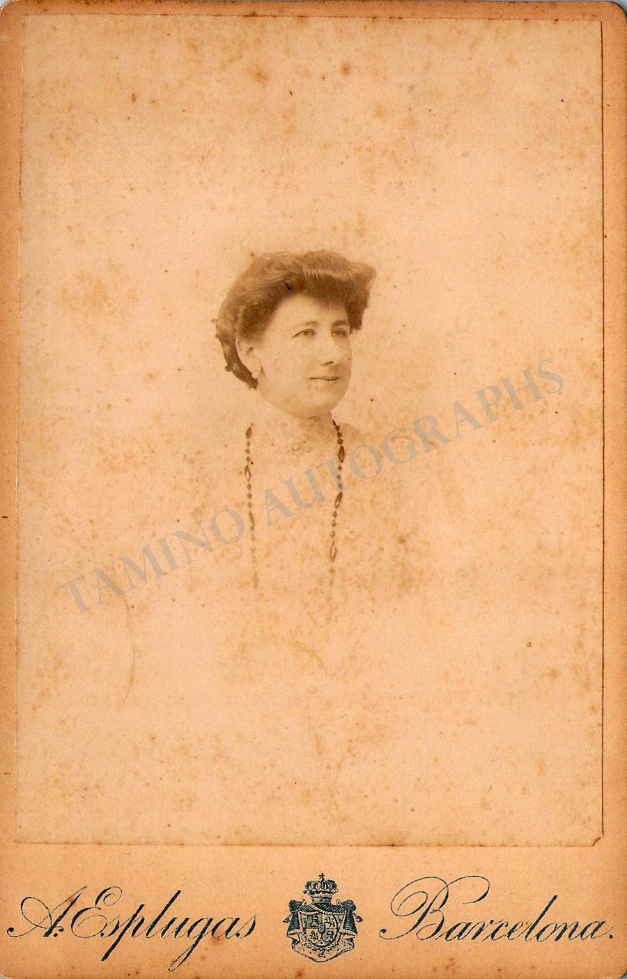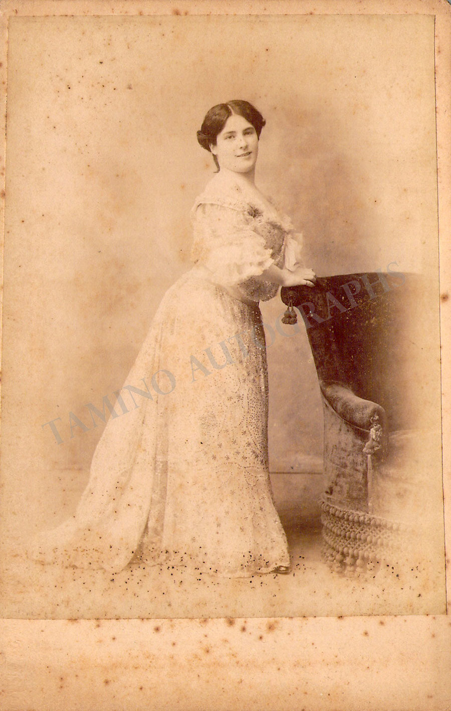 Vintage cabinet-style photograph of the singer shown as herself; minor rust stain on the front, ink markings on verso, otherwise in excellent condition.
