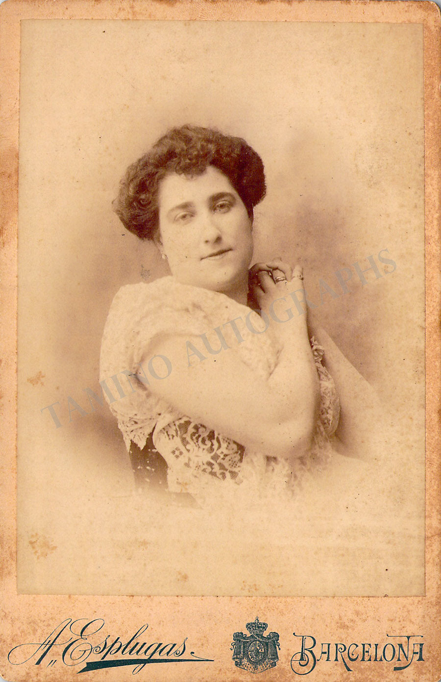 Vintage cabinet-style photograph of the singer shown probably in role; front in excellent condition, verso with mounting damage, minor ink markings on verso.