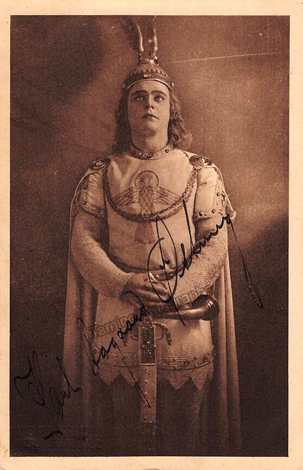 Norwegian tenor (1889-1968), signed photo postcard, shown in the title role in Lohengrin. Blind stamp on front by Magasin Metropol, Vienna. Size is 3.5 x 5.5 inches.
