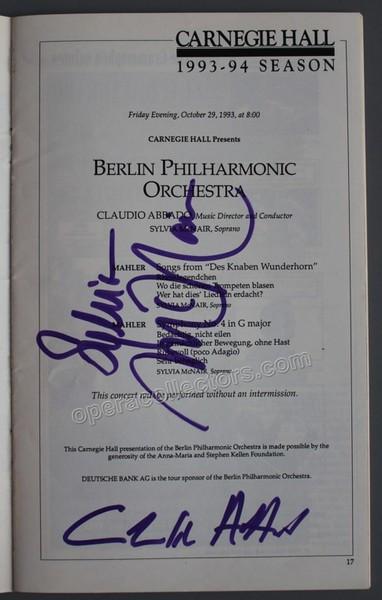 Claudio Abbado and Sylvia McNair signatures on a program, Berlin Philharmonic concert at Carnegie Hall. Gustav Mahler‚¬„¢s Knaben Wunderhorn and symphony n° 4.  October 29th, 1993