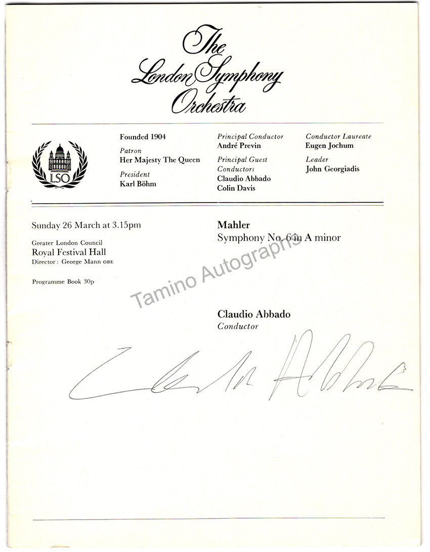 Program for a performance of Mahler's Symphony No.6 by the London Symphony Orchestra at the Royal Festival Hall, London, on March 25th, 1978, under the baton of the star Italian conductor, signed by him on the program page.