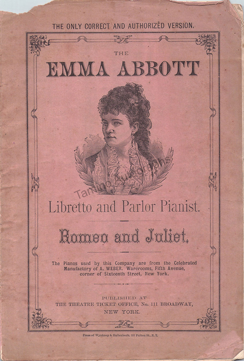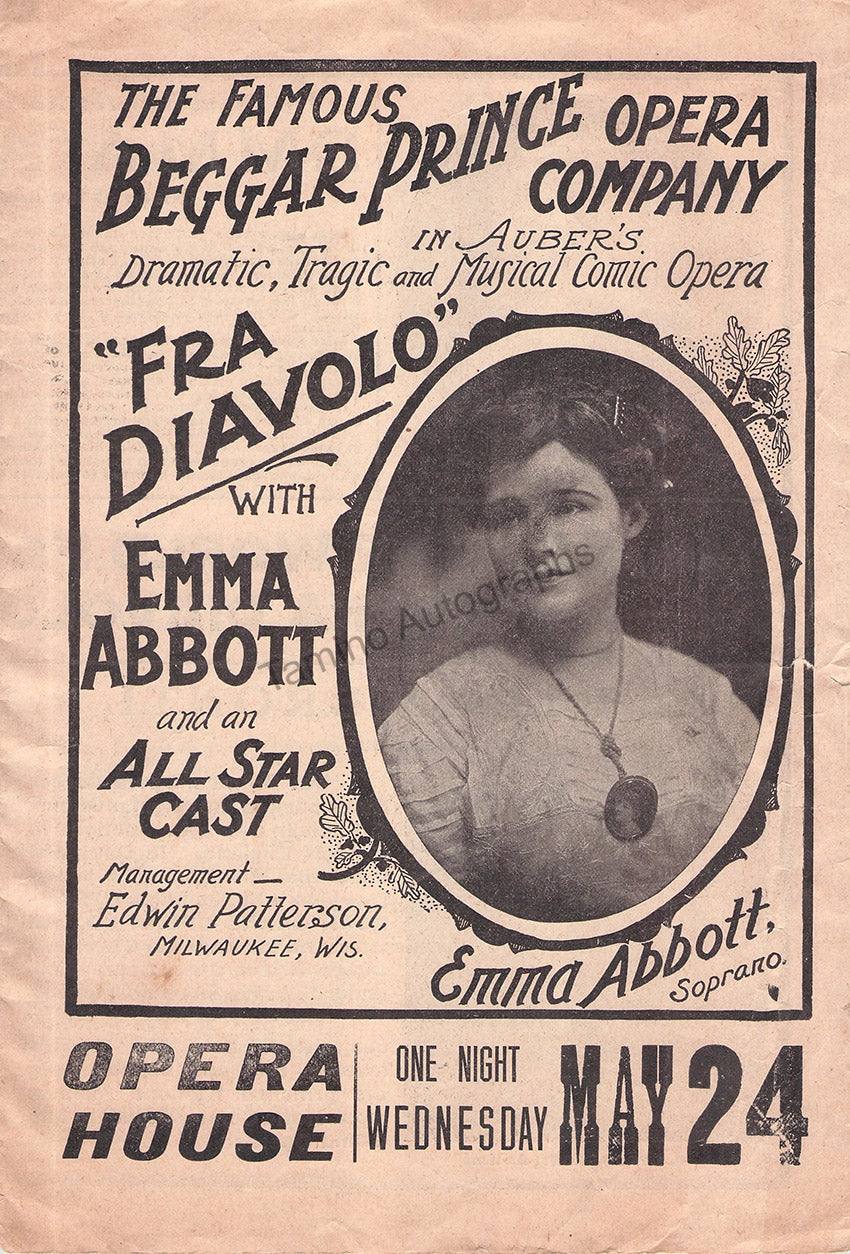 Set of two original vintage programs for performances of Emma Abbott, no dates, one in Milwaukee, Wisconsin, 4 pages, 7.1 x 10.4 inches, in good condition, the second is a libretto program for a performance with pianist, in New York, several pages, 6.8 x 10.1 inches, in fair condition. Sold together, not sold separately.