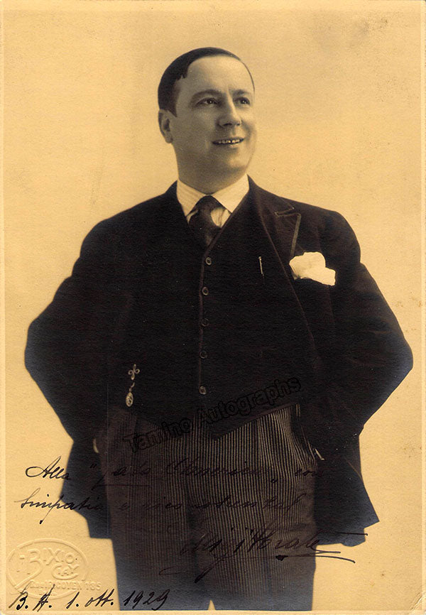 Italian tenor (1888-1931), signed photograph, shown as himself, inscribed with Buenos Aires, dated in 1939. Blind stamped on front by photographer Bixio. Size is 6.25 x 9 inches, small crease on bottom right, otherwise in very good condition.