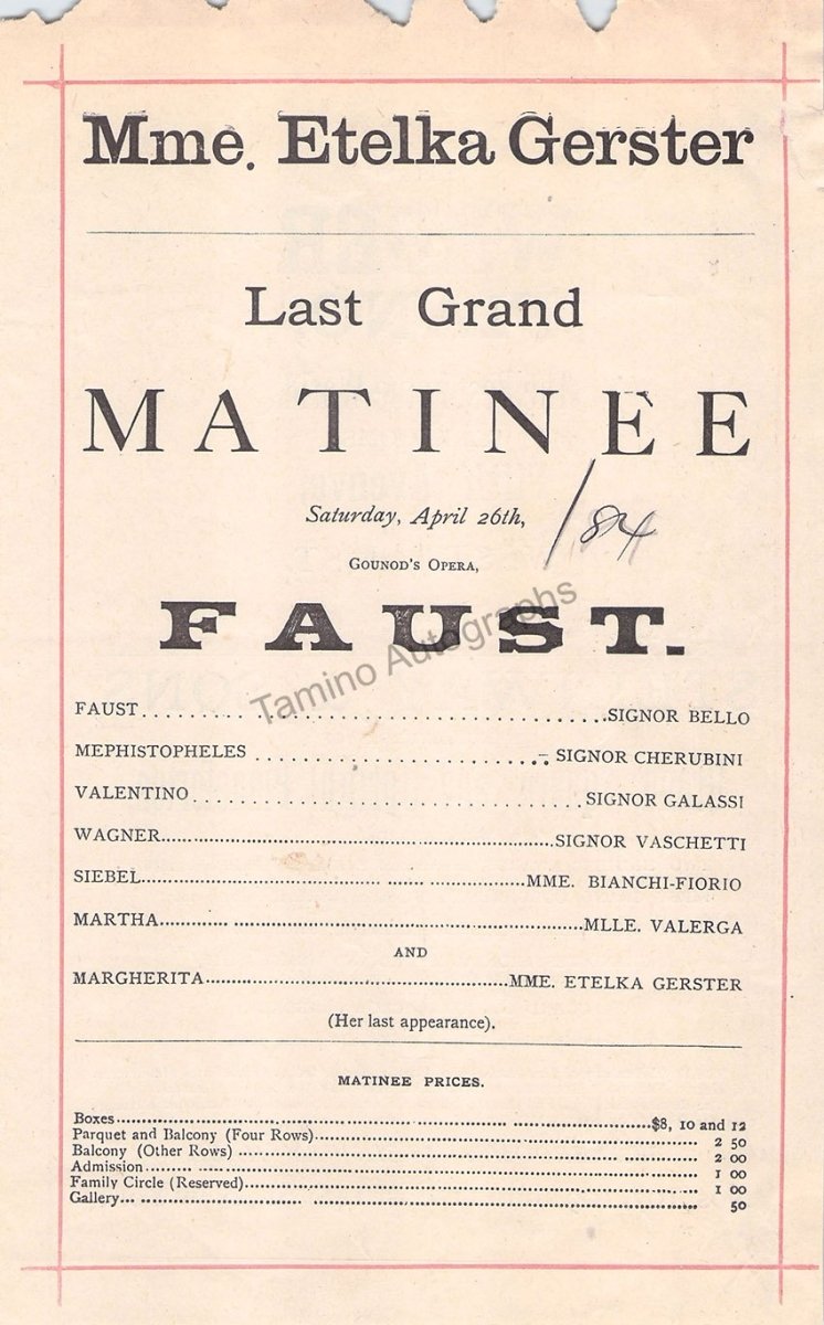 Set of 2 playbill announcements for opera performances at the Academy of Music, New York, with Adelina Patti in Semiramide and Etelka Gerster in Faust, 1884. Each playbill is 5.7 x 9.25 inches, minor loss of paper at the top margin, in overall very good condition.