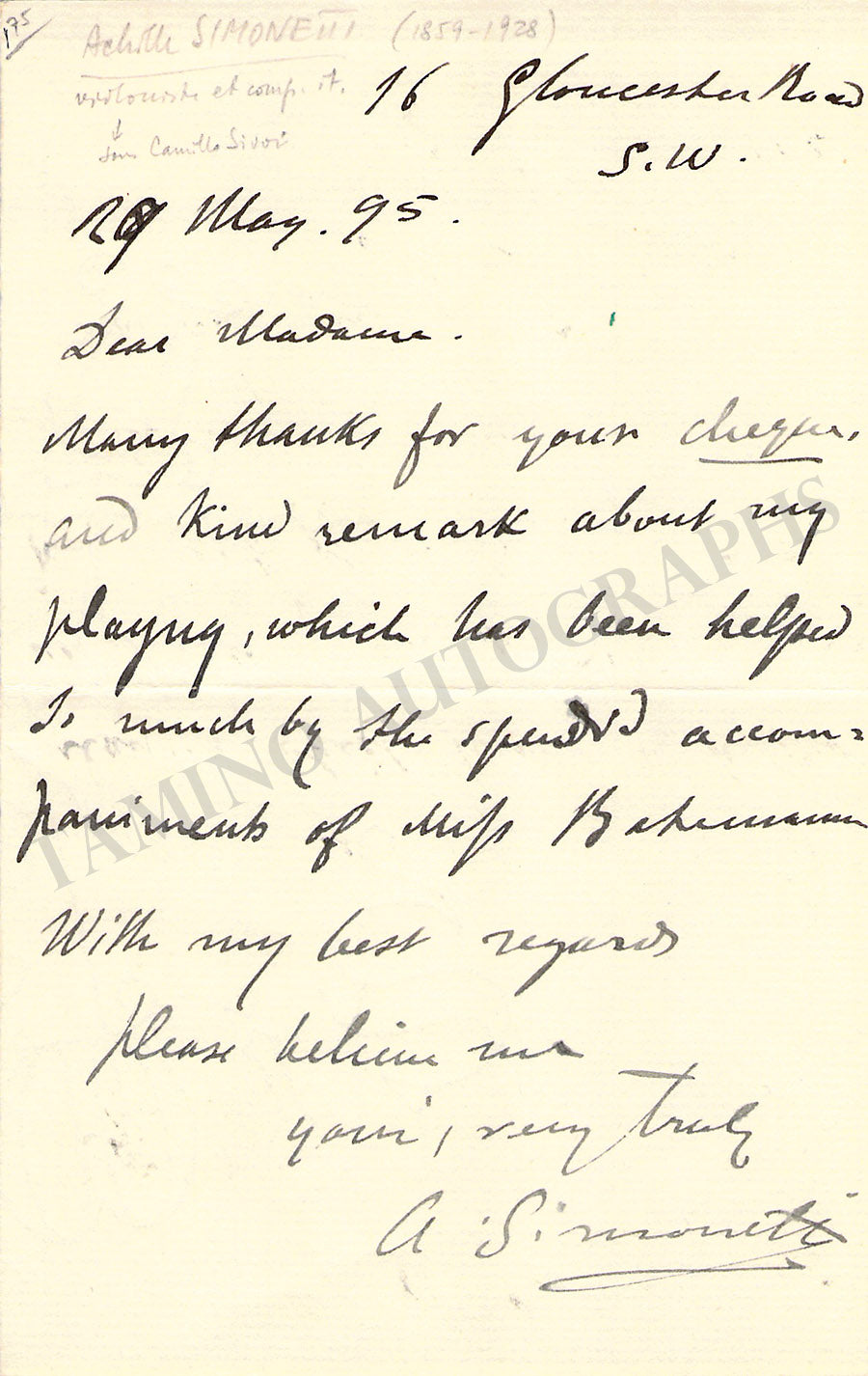 Autograph letter in English signed by him, dated May 29, 1895, to an unidentified lady: “many thanks for your cheque and kind remark about my playing, which has been helped so much by the splendid accompaniments...”. Size is 4.3 x 6.8 iches, 1 page, in very good condition.