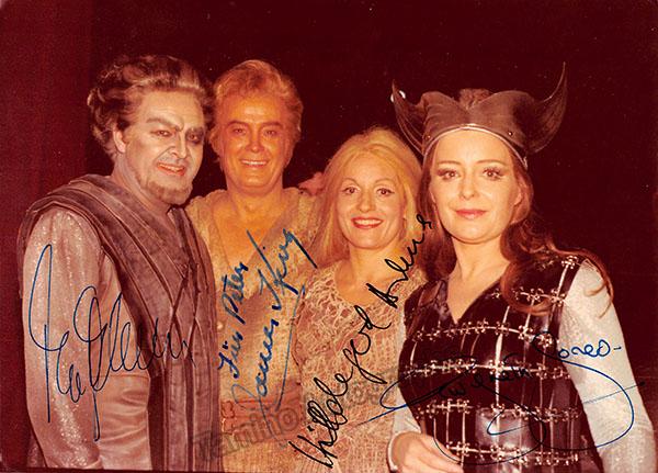 German bass-baritone Theo Adam (b. 1926), American tenor James King (1925-2005), German Soprano Hildegard Behrens (1937-2009) and Welsh Soprano Gwyneth Jones (b. 1936), quadruple signed photo. Shown in costumes backstage following a performance of Wagner's Die Walkure. Size is 6.75 x 5 inches. Large beautiful photo with very attractive costumes, distinct and clear signatures. In excellent condition.