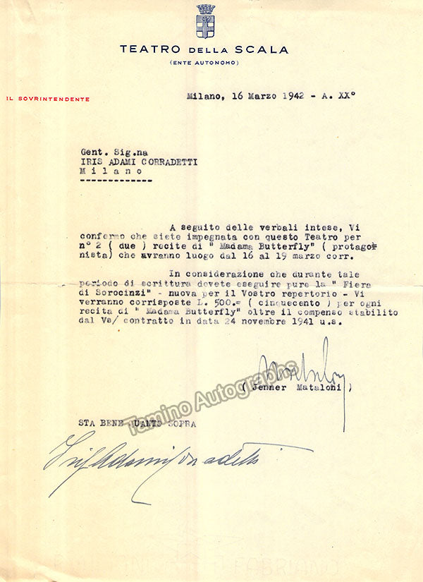 Typed letter signed contract from La Scala, Milan sent to her, dated in 1942, 1 page typed document, with Adami-Corradetti's handwritten signature at bottom and  signature of  of La Scala manager Jenner Mataloni above. Size is 7.5 x 10.5 inches, some creases and folds, otherwise in excellent condition.
