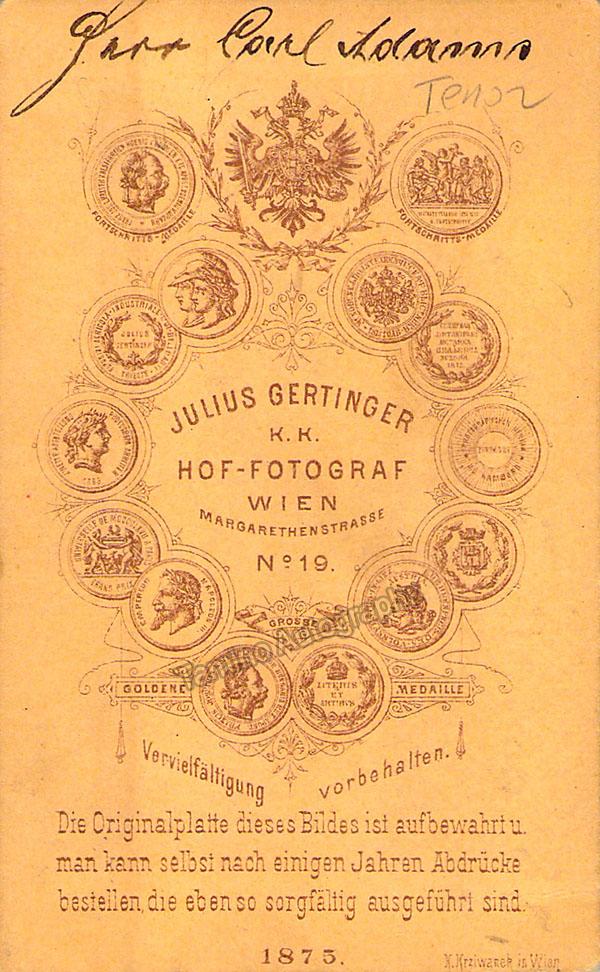 American tenor (1834-1900), unsigned CDV, shown as himself. Photo by Julius Gertinger, Vienna. Size is 2.5 x 4 inches, in excellent condition.l