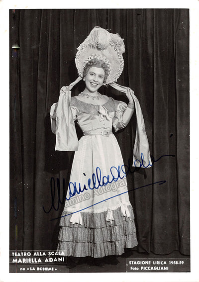 Signed photograph, shown as Musetta in Puccini's La Boheme. Photo by Piccagliani, La Scala, Milan. Size is 4 x 5.75 inches, in excellent condition.