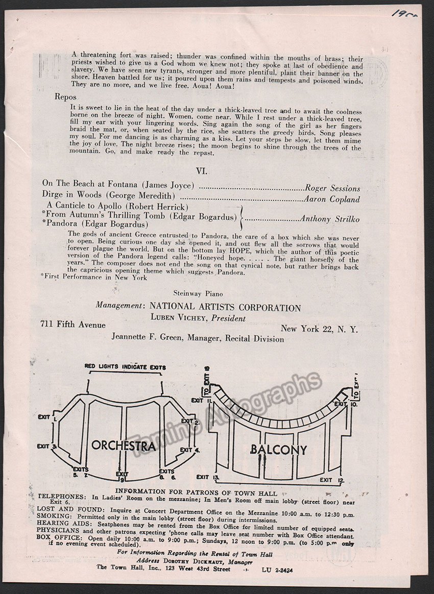 Lot of 3 programs signed by the African-American soprano. The first concert program was performed in New York, 1957, signed on the central program page, size is 6.5 x 9 inches, 14 pages. The second concert program was performed in New Haven, 1959, signed on program page by her and conductor Frank Brieff, size is 5.8 x 8.9 inches, 22 pages plus covers, in excellent condition. The third concert program was performed in 1960 with the Chicago Symphony Orchestra and was signed on program page by her and guest conductor Robert Shaw. Size is 5.75 x 8.75 inches, 36 pages, in excellent condition.