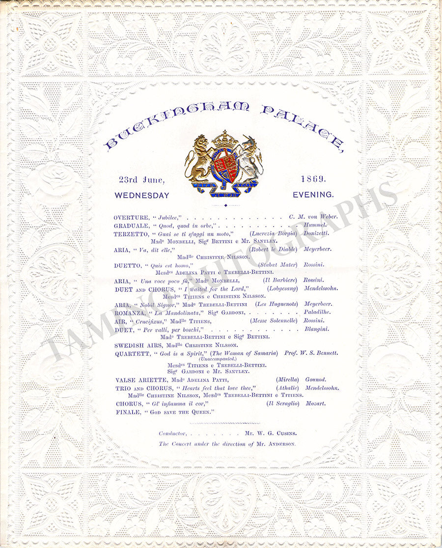 Beautifully embossed program for a concert on June 23, 1869, at Buckingham Palace, London, performed by star opera singers Adelina Patti, Christina Nilsson, Therese Tietjens, Antoniette Bettini-Trebelli, and others.