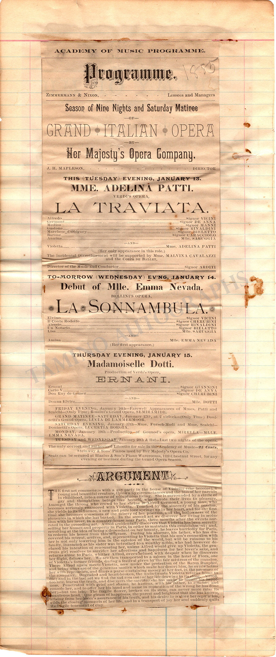 Set of 2 playbills mounted on a page for a performance of Verdi's "La Traviata" starred by Adelina Patti, Bellini's "La Sonnambula" starred by Emma Nevada, and Verdi's "Ernani" by Louise Dotti, at the Academy of Music, New York, January 1885.  On verso, a playbill announces the performance of other operas at the same opera house starring Patti, Nevada, Scalchi, and others.