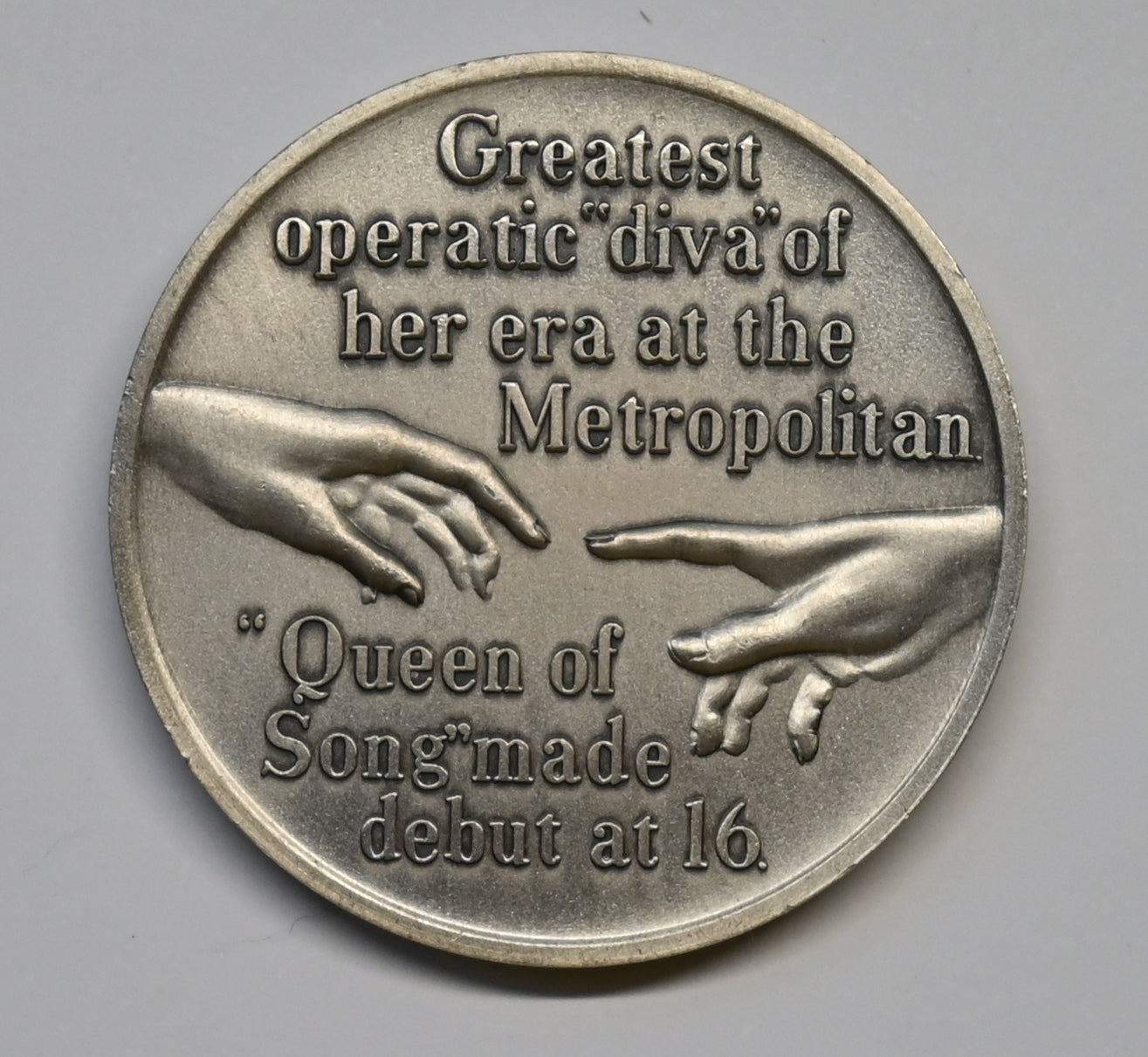 Silver medal commemorating her career at The Metropolitan Opera. Size is 1.5 inches in diameter, .925 sterling silver, #0360 on edge, minor wear.