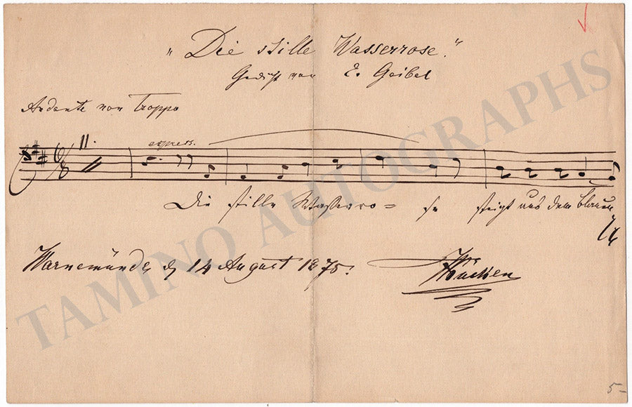 5-bar autograph music quote from Liszt's "Die Stille Wasserrose" with words by Emanuel Geibel, signed by Hacker and dated in Warnemünde, August 13, 1875. Size is 7.2 x 4.6 inches, evident central fold, few creases, in overall very good condition.