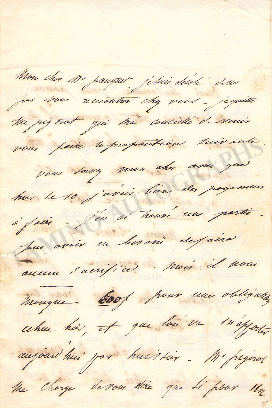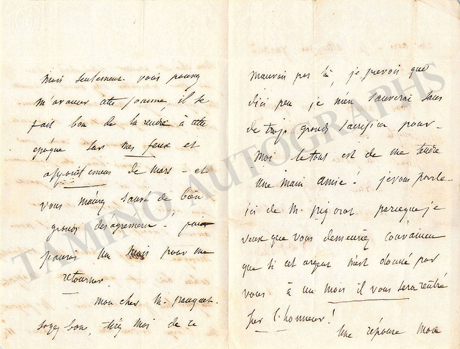 Autograph letter in French (sold untranslated) signed by him, no date, addressed to a certain Mr. Pauquet requesting payment in advance to comply with some of his debts.  Size is 5 x 7.4 inches on each page, 4 written pages in one folded sheet, some smudge and folds, in overall very good condition.