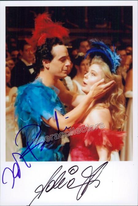Austrian baritone (b.1970), a very much awarded singer, well known for singing with the Vienna Chamber Opera and Austrian-Hungarian soprano, who belong to the Vienna Opera ensemble, where she participated in about 40 roles. Super colorful photo signed by both singers, shown on stage in Die Zauberflote, opera by Mozart. Size is 5 x 7 inches.