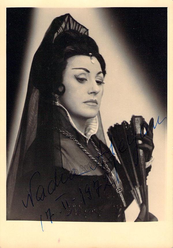 Bulgarian mezzo-soprano (1917-2000), signed photo, shown as Princess Eboli in Verdi's Don Carlo, dated in 1972. Stamped on verso by photographer Kurt Kreutzinger, Berlin. Size is 4 x 5.75 inches, some wear on edges but otherwise in very good condition.