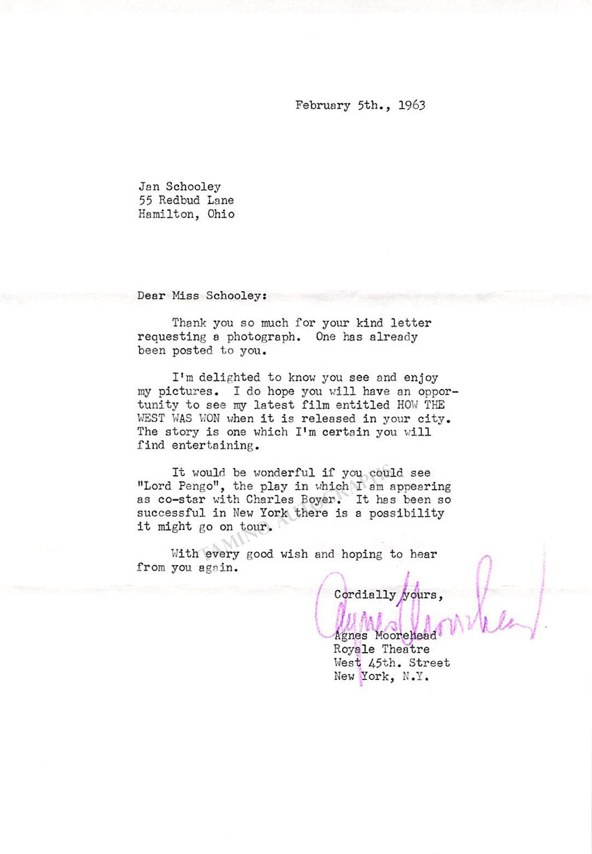 ALSO INCLUDED is a typed letter signed by her with a purple color pencil, dated 1963. Size is 7.25 x 10.5 inches, 1 page, in excellent condition