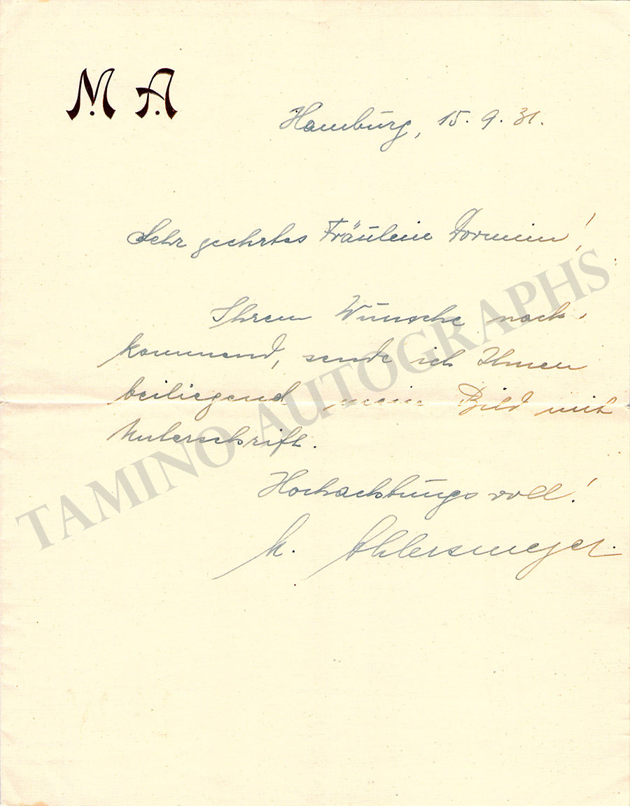 German baritone (1896-1979), autograph note signed 1 page, written in German on embossed letterhead, sold untranslated, dated in 1931. Size is 6.75 x 8.75 inches, several creases and folds, otherwise in excellent condition.