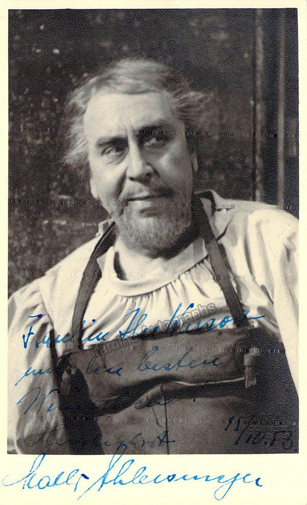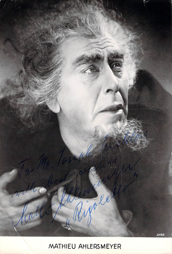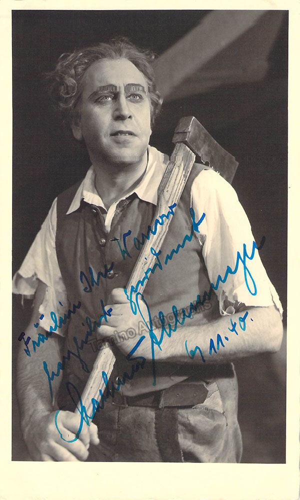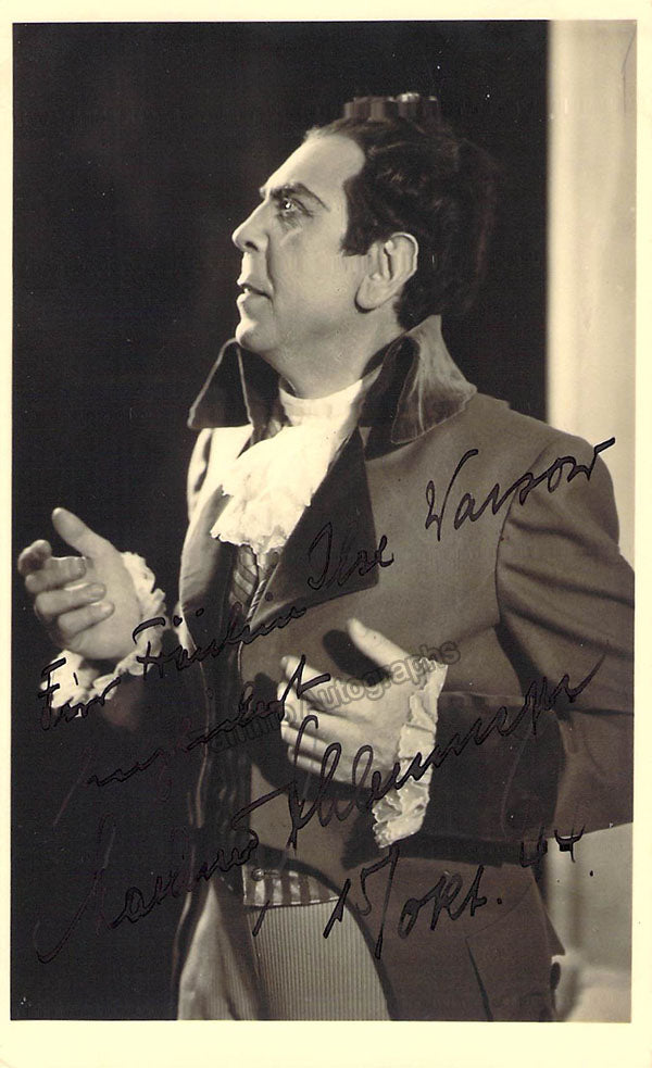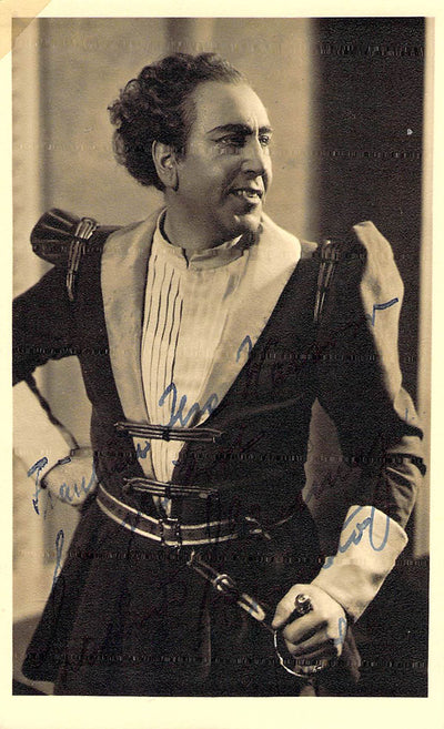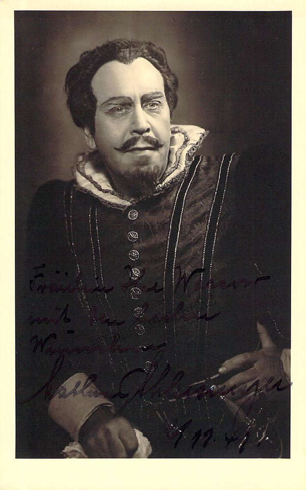 Signed photograph, shown in the title role of Verdi's Rigoletto, inscribed and dated in 1943. Stamped on verso by photographer Rudolf Pittner, Vienna. Size is 5 x 6.75 inches, in excellent condition.