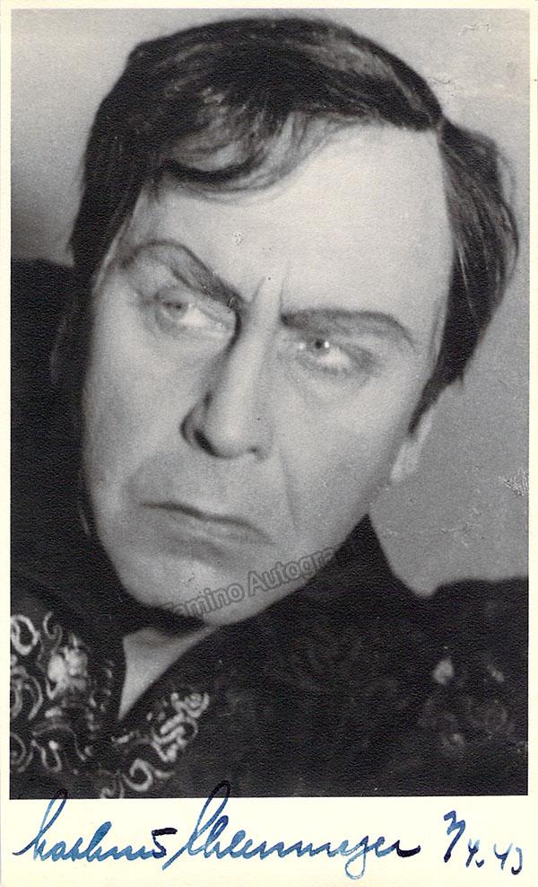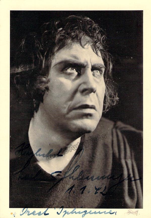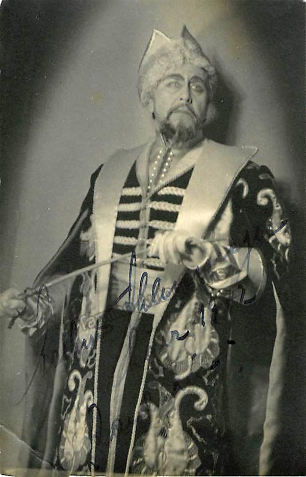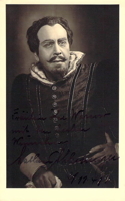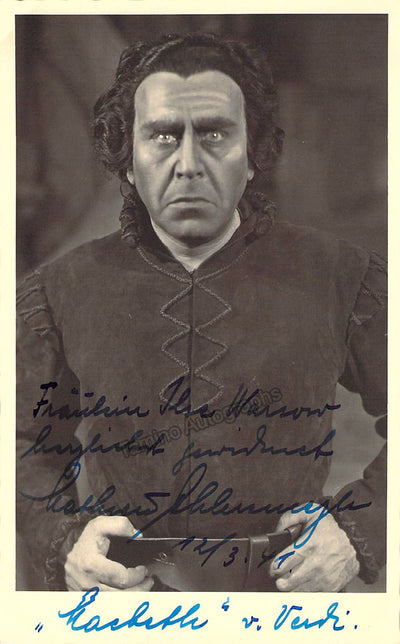 Signed postcard photograph, shown in the title role of Verdi's Macbeth, inscribed and dated in 1943. Stamped on verso by Berger photo studio, Dresden. Size is 3.5 x 5.5 inches, in excellent condition.