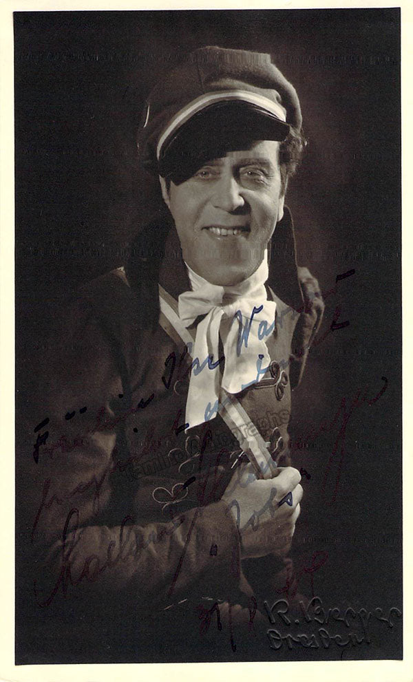 Signed postcard photograph, shown in role, inscribed and dated in 1941. Stamped on verso by photographer Reinhard Berger, Dresden. Size is 3.5 x 5.5 inches, in excellent condition.