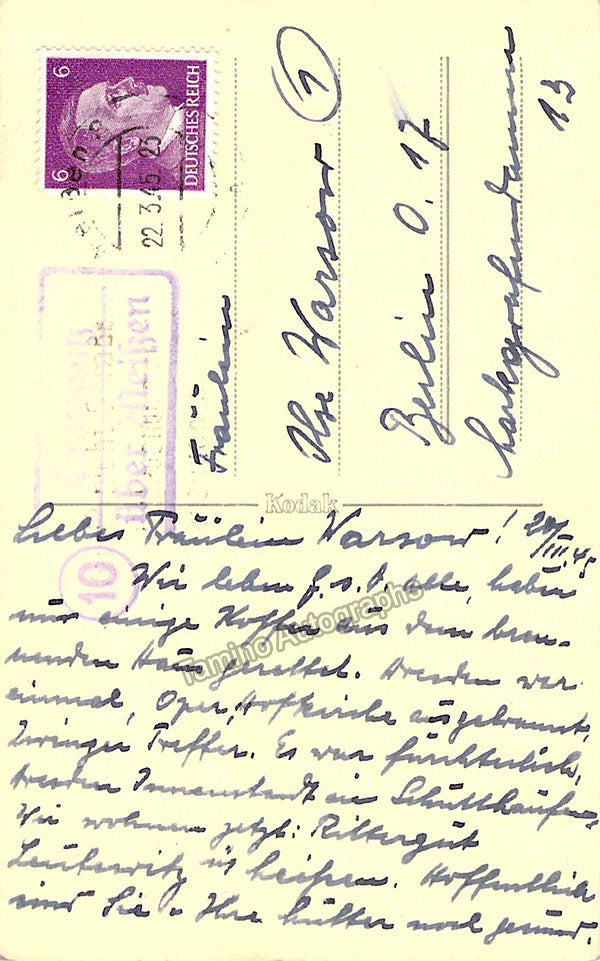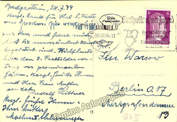 Signed postcard photograph, shown in role, inscribed and dated in 1944. Stamped on verso by photographer Reinhard Berger, Dresden. Size is 3.5 x 5.5 inches, in excellent condition.