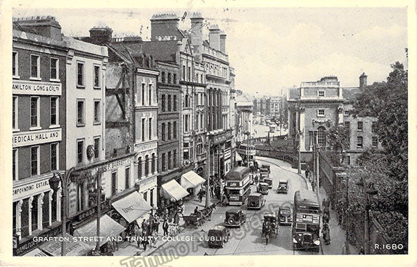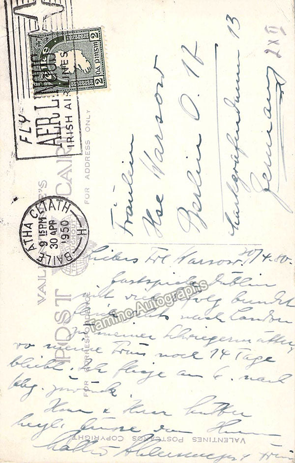Signed postcard with a photograph of Dublin, text on verso. Size is 3.5 x 5.5 inches, small creases on the left side, otherwise in excellent condition.