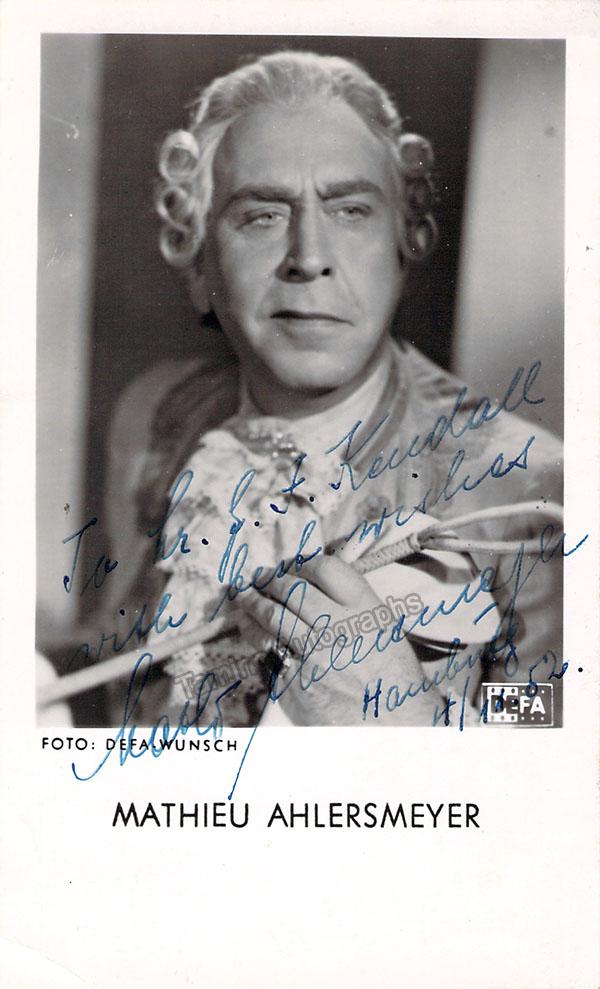 Signed postcard photograph, shown in role, inscribed and dated in 1948. Blind stamped on front by photographer Reinhard Berger, Dresden. Size is 3.5 x 5.5 inches, in excellent condition.
