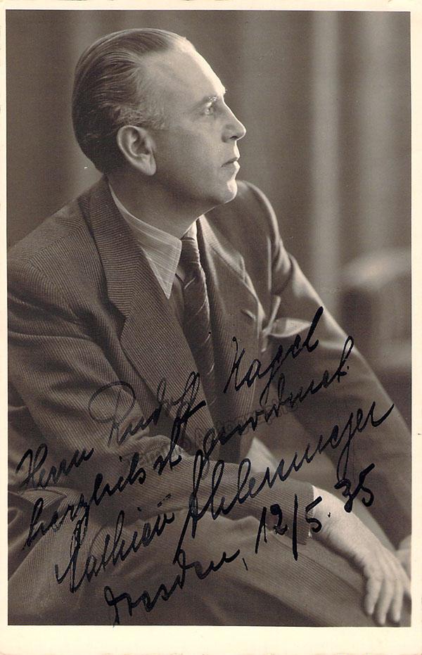 Signed photo postcard, shown as himself. Inscribed and dated in 1935. Stamped on verso by photographer Berger, Dresden. Size is 3.5 x 5.5 inches, in excellent condition.