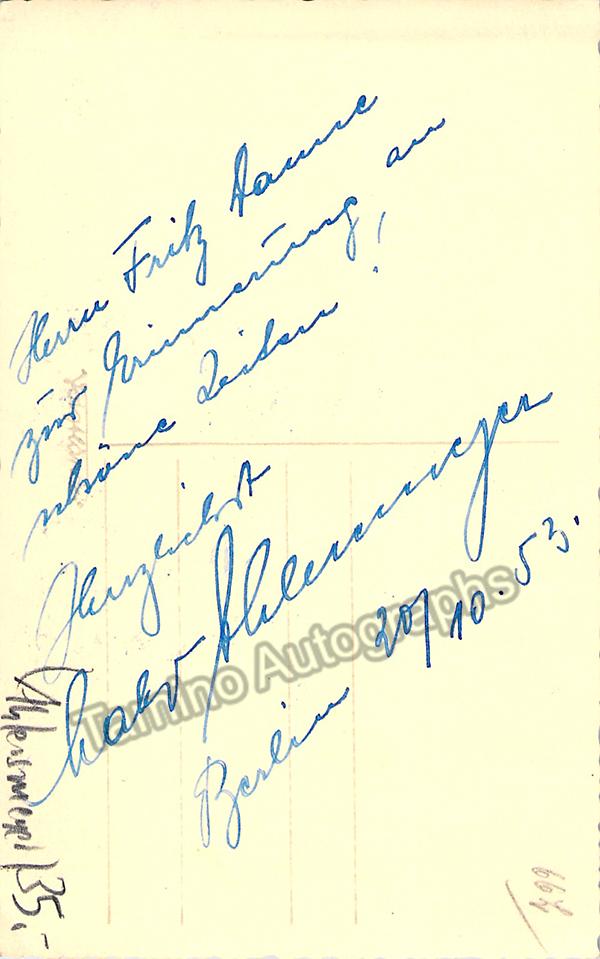 Photo postcard signed and inscribed on verso, shown as himself, dated in 1953, Berlin. Size is 3.25 x 5.25 inches, in excellent condition.