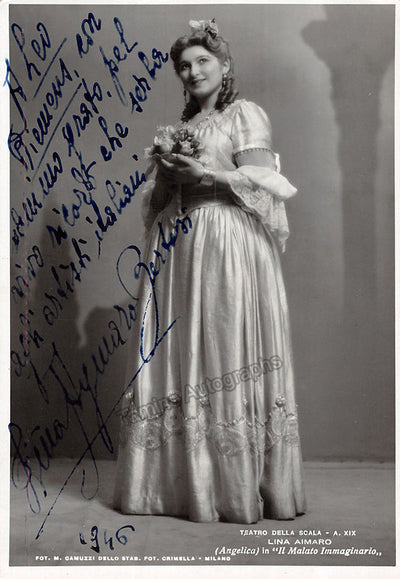 Signed postcard photograph, shown as Angelique in Il Malato Immaginario (the French title is Le Malade imaginaire), a three-act comedie -ballet by the French playwright Molière with dance sequences and musical interludes by Marc-Antoine Charpentier. Inscribed with sentiment, dated in 1946. Photo by M.Camuzzi, La Scala, Milan. Size is 4 x 5.8 inches, in very good condition.