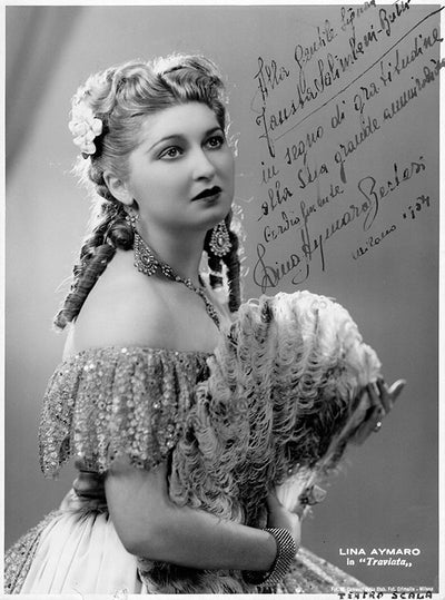 Signed photograph, shown as Violetta in Verdi's La Traviata at La Scala, Milan, with extensive inscription, dated in 1954. Photo by M.Camuzzi, La Scala, Milan. Size is 6.75 x 9.25 inches, with small scotch tape residue at bottom, otherwise in excellent condition.