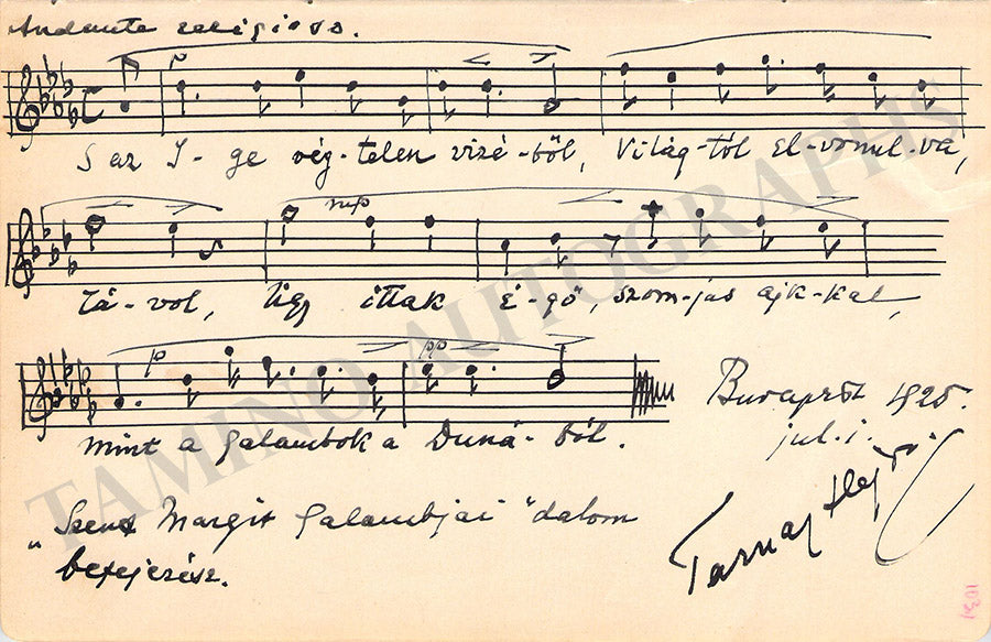 Autograph 9-bar music quote from his lied "Die Tauben der Heiligen Margarethe" signed by him, dated in Budapest, July 1, 1925. Size is 7.2 x 4.7 inches, in very good condition.