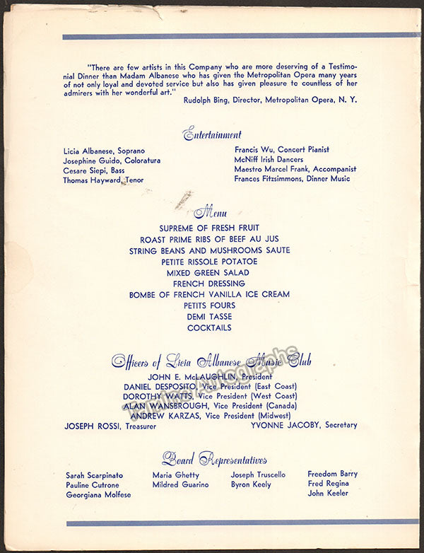 Italian soprano (1913-2014) and Italian tenor (1885-1969), double signed program of a Testimonial dinner for the Soprano presented in New York in March 1959, signatures are both on the cover page. Size is 8.5 x 11 inches, very small tears at the top of the program, not affecting image and signatures. Otherwise in very good condition.