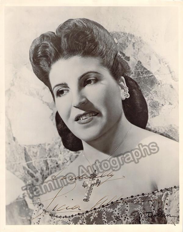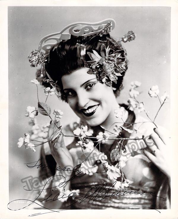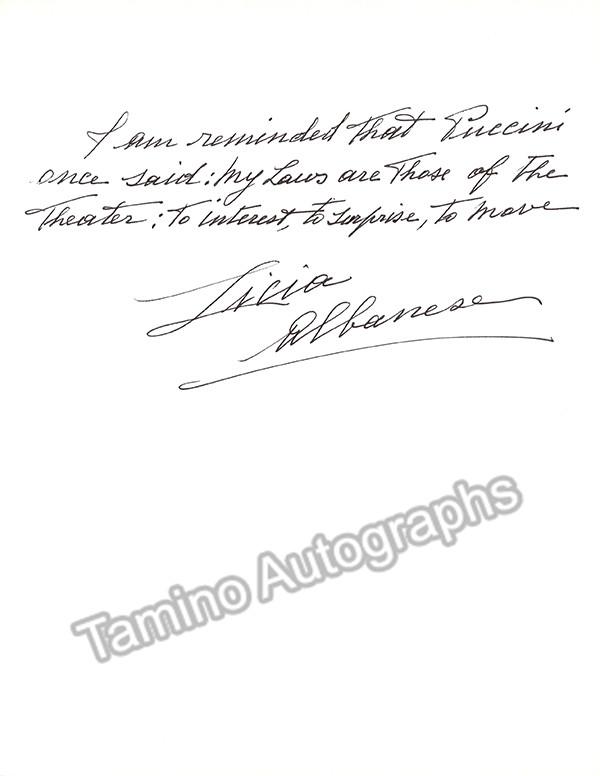 Licia Albanese (1909-2014), lot of 6 autographs: color photo signed by Bidu Sayao and Licia Albanese (N9168-R3-2), signed quote (M2517-G2-1), signed photo as Butterfly (M1250-R5-2), Manon (M1275-R5-2) and (M1251-R5-2), and probably as herself (M1954-R2-4)