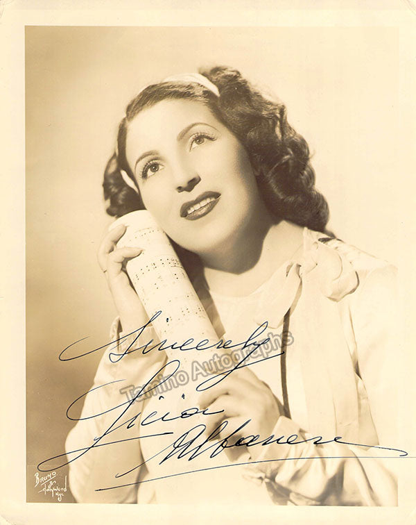 Signed photograph, shown as Marguerite in Gounod's Faust, inscribed. Printed signature on front and stamped on verso by photographer Bruno of Hollywood and NYC. Size is 8 x 9.75 inches, small tear on top left, otherwise in very good condition.