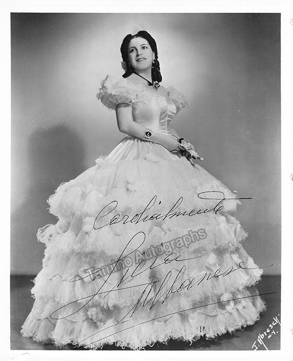 Signed photograph, shown as Violetta in Verdi's La Traviata. Printed signature on front of photographer James Abresch, New York. Size is 8 x 10 inches, in very good condition.