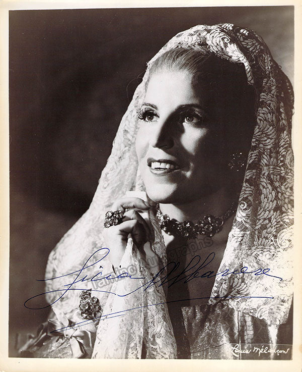 Signed photograph, shown as Violetta in Verdi's La Traviata. Handwritten signature on front of photographer Louis Melancon. Size is 8 x 10 inches, small crease on bottom left, otherwise in very good condition.