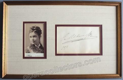 Star soprano (1847-1930), the first Canadian singer to become an international star. Beautiful carte de visite (CDV) framed with a large size signature on paper, dated 1893. Sizes are 14.75 x 9.5 inches (full frame size), 2.25 x 4 inches for the CDV (viewable window size), signature is 5.25 x 3.25 inches (viewable window size)