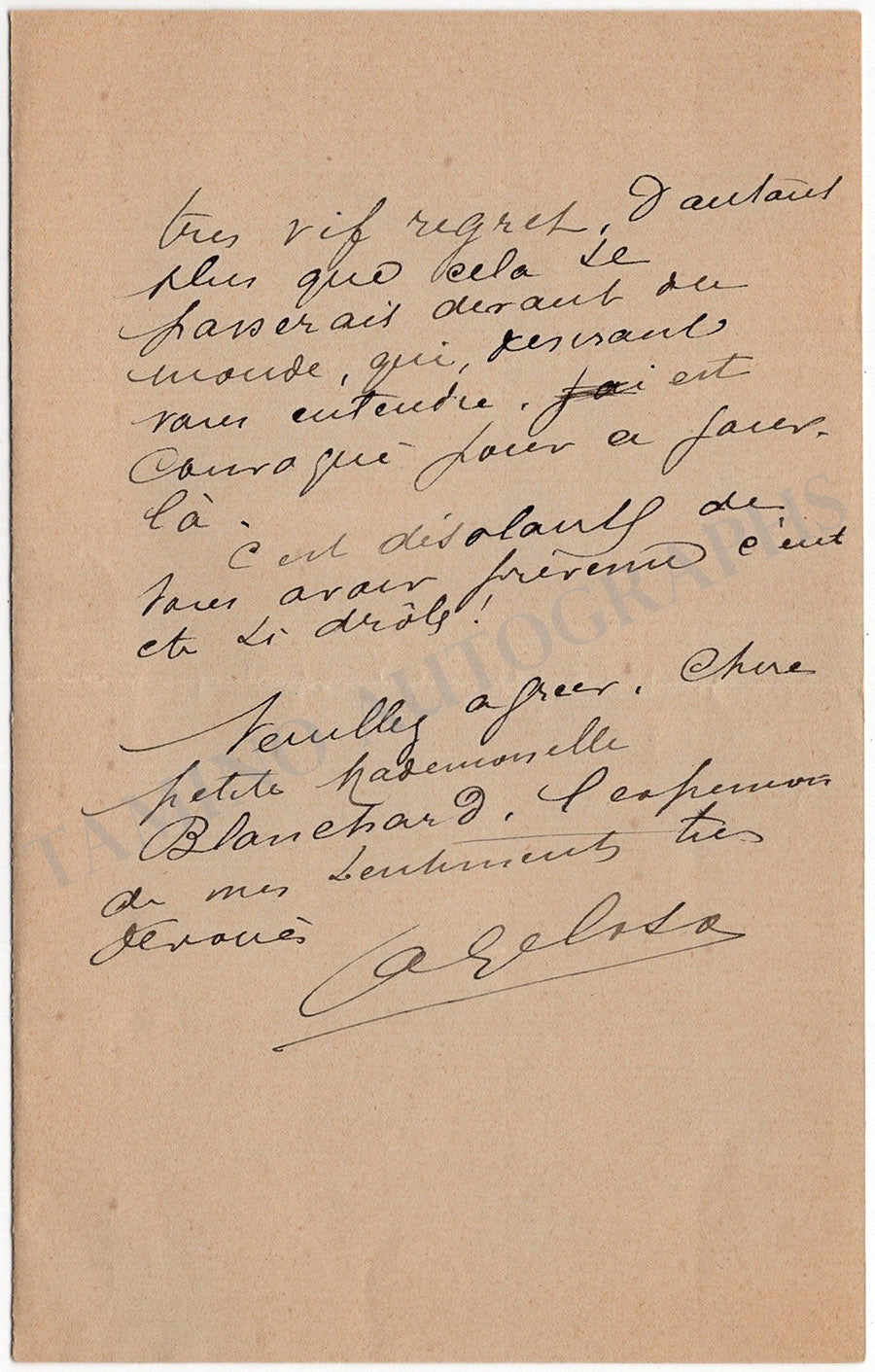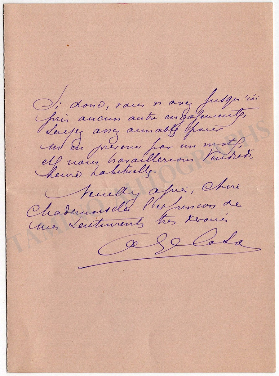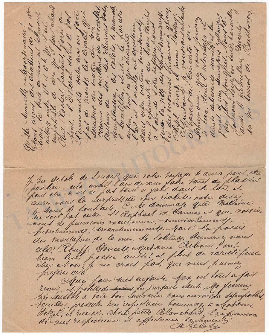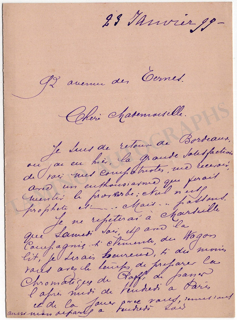 Lot of five autograph letters in French (untranslated) signed by him, dated between 1899 and 1900. Letters are addressed to musicians such as Mademoiselle Blanchard and concern rehearsals of music pieces of Joachim Raff and Mozart, upcoming trips, and other private matters.