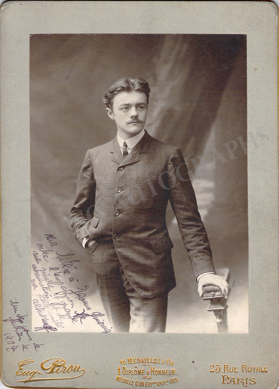 Very nice black-and-white cabinet photograph signed and inscribed by him with a long sentiment dated February 1907, shown at a very young age; an original cabinet by Eugene Pirou (Paris). Size is 5.25 x 7.4 inches, in excellent condition.