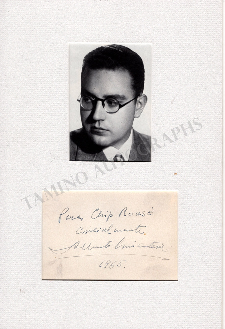 Card signed by him matted with his unsigned photograph, inscribed to American composer Christopher Rouse. Card is 4.5 x 3 inches (visible window size), photo is 2.75 x 3.8 inches (visible window size), for a total size of 7.5 x 11 inches, in excellent condition.