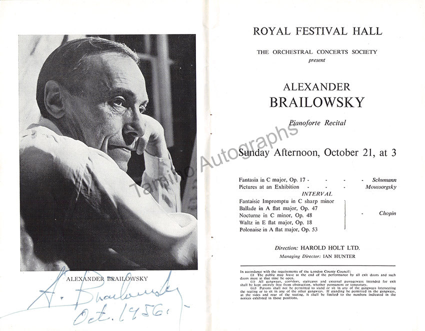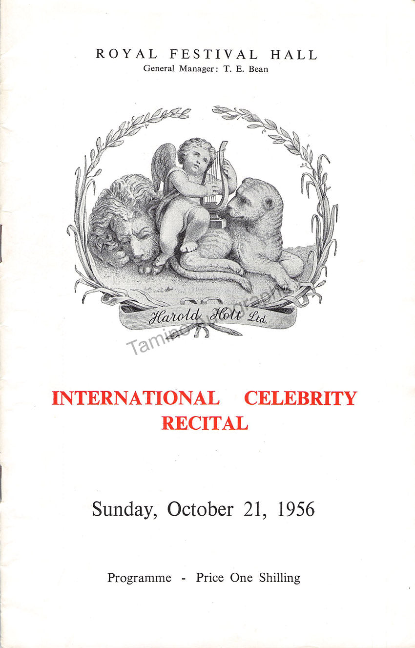 Program for a solo recital at the Royal Festival Hall, London, on October 21st, 1956, signed by him on his photo page. Size is 5.4 x 8.4 inches, full program with all pages and covers, in excellent condition.