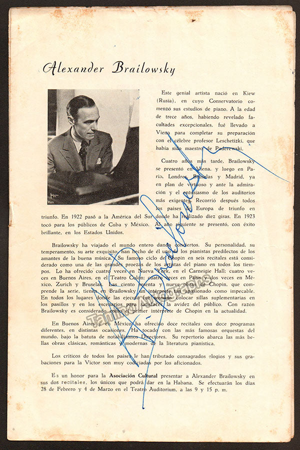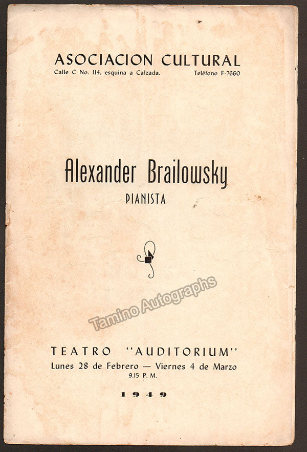Program for a series of performances by the celebrated pianist at Teatro Auditorium, Havana, from February 28 until March 4, 1949, signed by him on his bio page. Size is 6.25 x 9.25 inches, full program, some rust stains, in overall good condition.